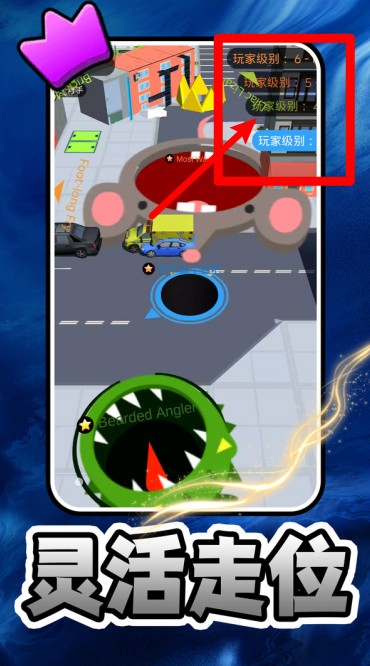 2.玩家等级比拼:画面右上角实时显示等级排行,灵活走位持续吞噬周围物体来快速压制其他对手玩家。