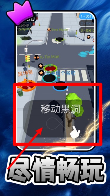 3.移动黑洞操作:点击并滑动屏幕即可控制黑洞方向,操作方式非常直觉易懂,轻松体验解压快感。