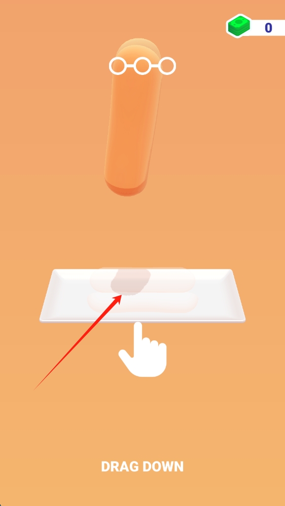 2、食材处理环节,需 “DRAG DOWN”(向下拖动 )操作,将橙色食材(类似香肠 )放置托盘,点击拿起。
