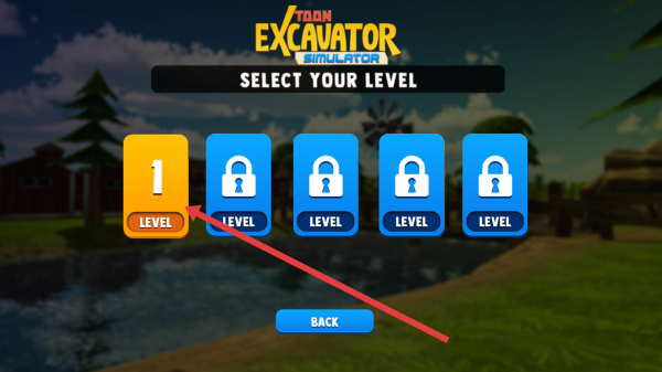 2、选关页选择“LEVEL-1”,进入首关,在乡村场景(河流、草地),开始挖掘机操作任务,熟悉驾驶与挖掘机制。