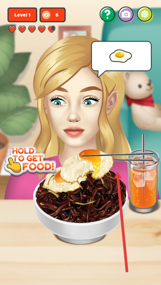 2、按提示【HOLD-TO-GET-FOOD】长按,为角色夹取面条、煎蛋,满足饮食需求,注意节奏,避免失误。