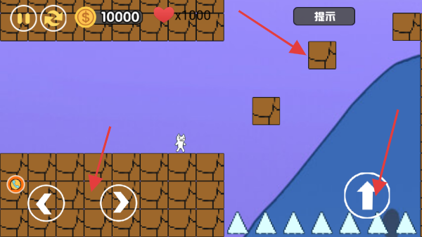 3、进入游戏场景后,通过左下角方向键控制角色移动,右下角跳跃键使角色跳跃,躲避障碍物(如尖刺),顺利通过关卡。