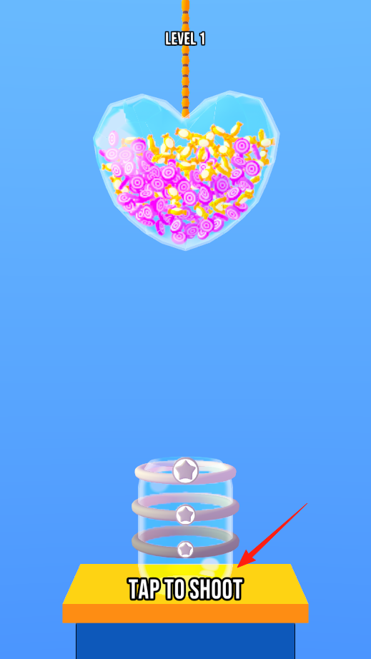 1、进入第一关,可以看到上方心形水晶里装满糖果,下方有带弹簧的罐子,点击【TAP TO RETRY】,罐子会发射蓝色小球,目标是打碎水晶,让糖果掉进罐子里。
