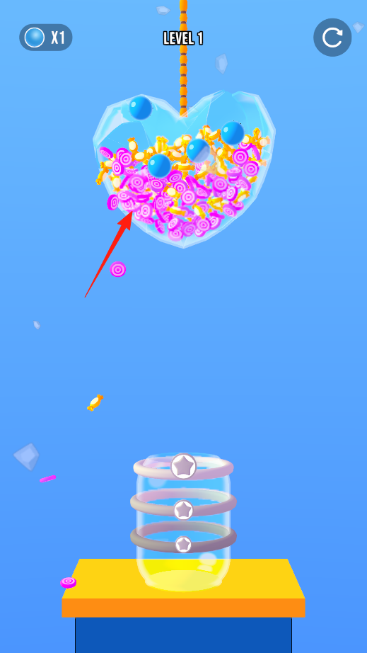 2、点击发射后,蓝色小球飞向水晶,打碎它后糖果开始往下掉,但要注意,下方罐子的弹簧会影响糖果收集,看着糖果噼里啪啦掉,体验收集的乐趣。