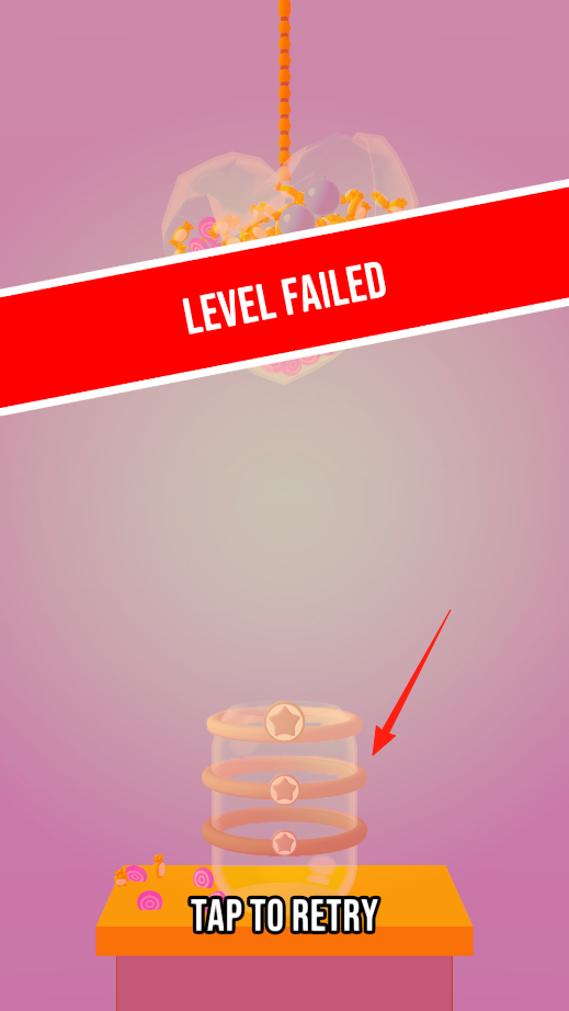 3、要是糖果没怎么掉进罐子,就会显示【LEVEL FAILED】,点【TAP TO RETRY】重新来,争取这次让更多糖果落进罐子,玩出不服输的闯关劲儿,非得把糖果都收集到才行。