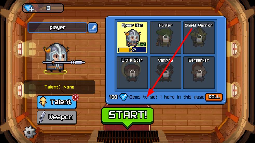 2、选角界面中默认选中“Spear Man”角色,花费100宝石点击“ROLL”可以抽取其他角色,点击“START!”按钮开始。