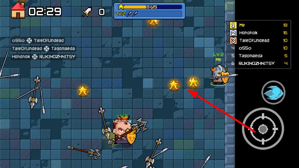 3、开启对战后利用右侧摇杆操控角色移动,收集场景中的星星提升等级,同时躲避并参与和其他玩家的战斗。