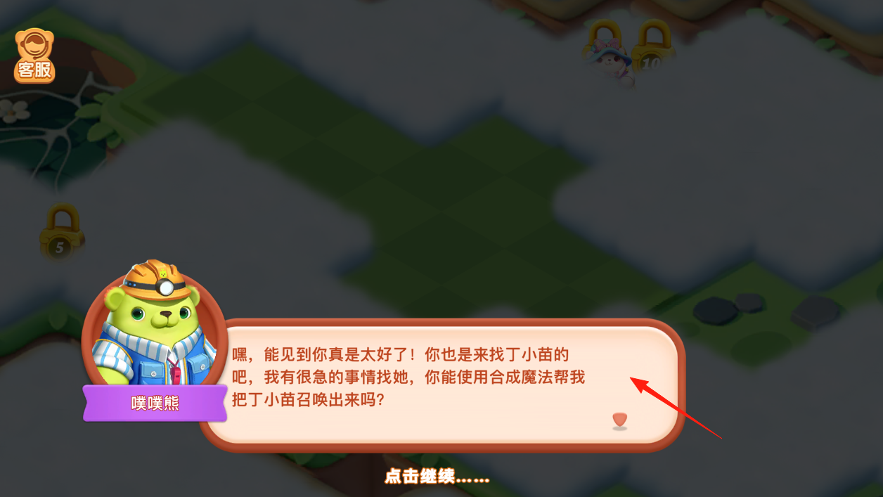 1、进入欢乐合成岛,我们可以发现遇到噗噗熊了,它急着找丁小苗,还请咱帮忙,点“点击继续”,接着就得用合成魔法召唤丁小苗,然后准备开启合成操作,帮噗噗熊解决难题。