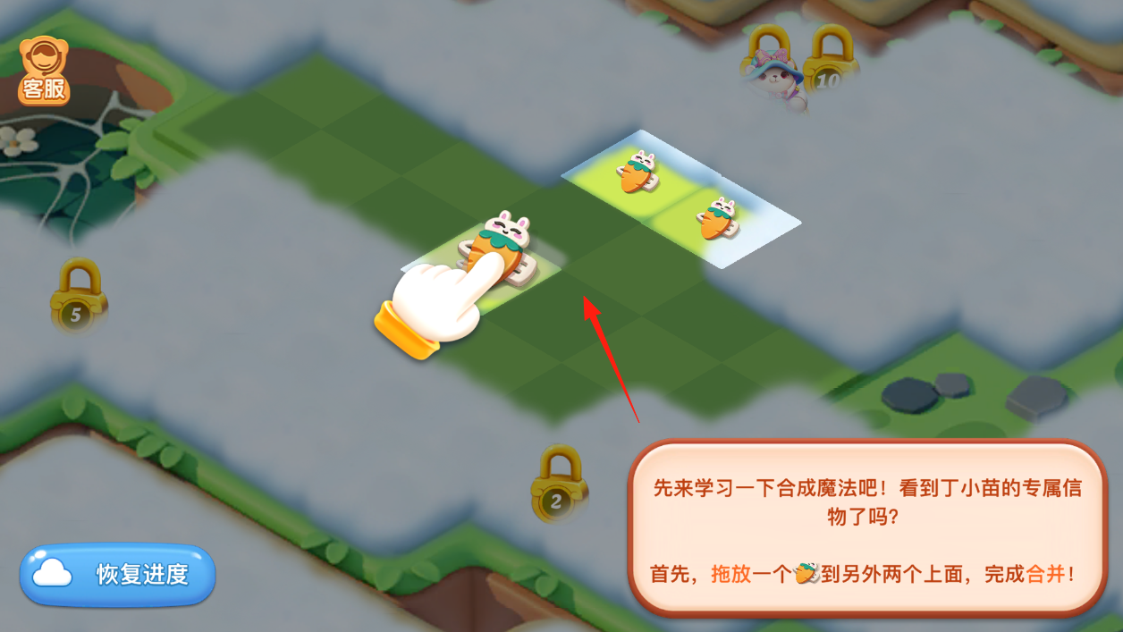 2、要学习合成魔法咯,界面有丁小苗的专属信物,按照提示,把一个信物拖到另外两个上面,完成合并,通过这种拖放合并的操作,解锁新内容,一步步掌握合成玩法,超有探索感。