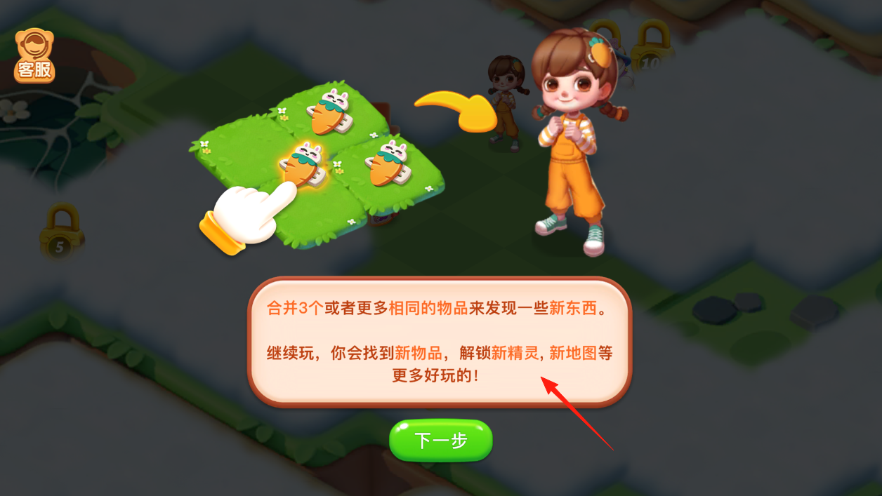 3、合并成功后,点“下一步”继续,之后就可以接着找相同物品合并,解锁新精灵、新地图啥的,每一次合并都可能带来新惊喜,玩起来超有意思。
