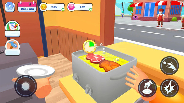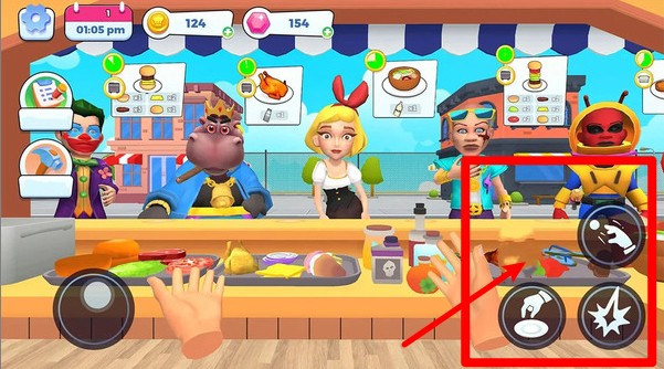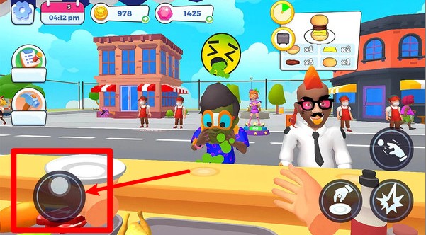 3.左下角的虚拟摇杆是移动控制核心,配合操作按钮使用可在厨房和前台自由走动,上菜、抓人、抢菜全靠这颗“移动大脑”。
