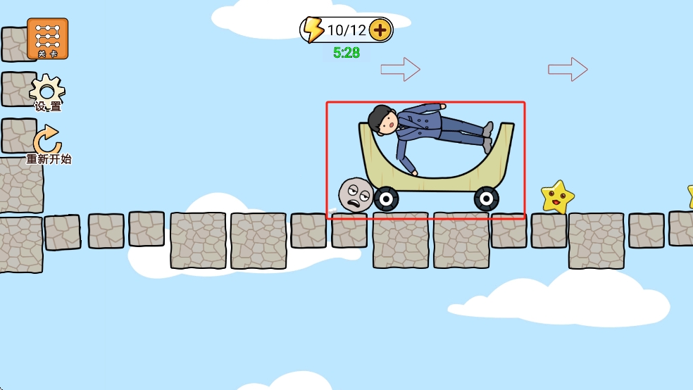 2、关注红框内载着角色的小车,通过点击屏幕左右侧箭头或滑动控制小石头推着小车移动,跨越石砖路障,避开陷阱,收集星星。