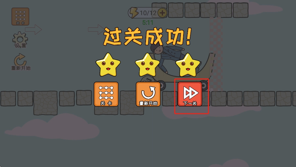3、过关成功后,点击红框内下一关按钮,进入新关卡挑战,若想重玩本关可点重新开始,也能通过关卡按钮返回选关界面。