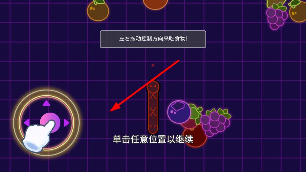 1、进玩家通过左右拖动控制方向,引导蛇去吃食物,通过左下角虚拟摇杆或点击屏幕拖动,调整霓虹蛇方向,点击任意位置跳过引导,开启吞噬冒险。