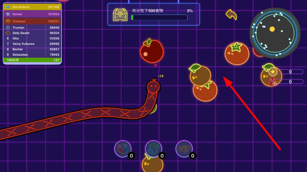2、操控霓虹蛇在地图移动,主动吞噬各类水果,上方显示积累共计吃下食物的进度调,同时留意避开其他玩家或危险区域,保证蛇身存活并成长。