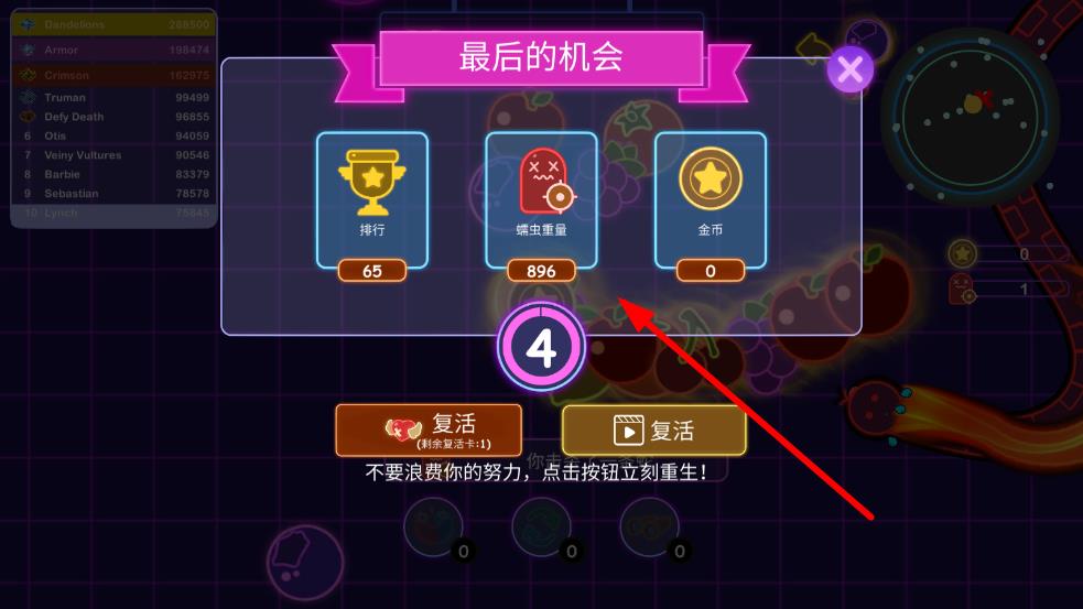 3、如果不小心失误死亡,会弹出“最后的机会”界面,可选择消耗复活卡或观看广告复活,继续积累排行、蠕虫重量等数据;存活至结算,可依据吞噬成果解锁奖励。