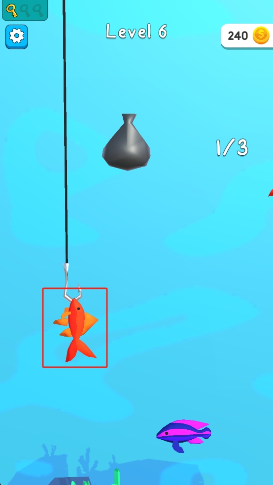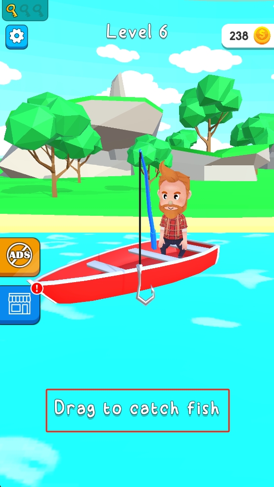 1、进入游戏后可以发现每一关的玩法都不一样,这里拿第六关举例,长按屏幕拖动鱼竿,控制鱼钩移动,准备钓鱼。