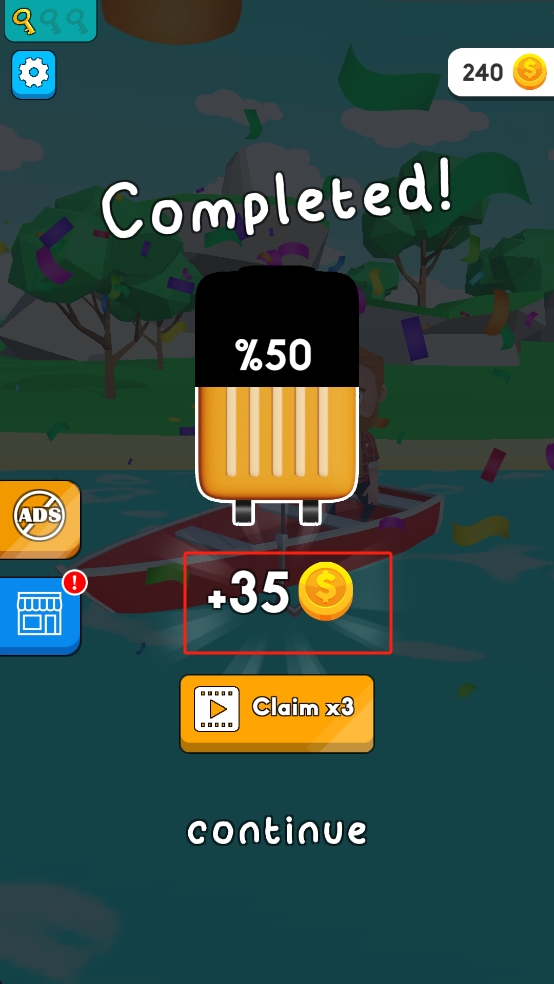 3、完成关卡后可获得35金币奖励,点击Claim x3按钮看广告能将奖励翻倍,中间的行李箱进度条满了还能解锁神秘奖励。