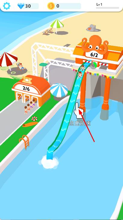 1、进入乐园关卡,点击滑梯区域“点击加速”,让游客快速滑行,提升体验。