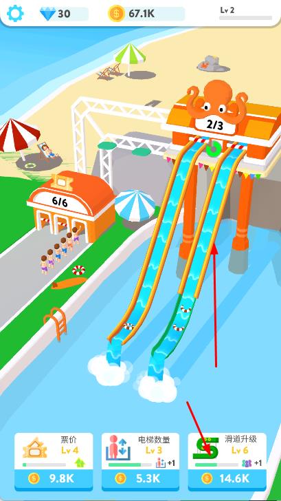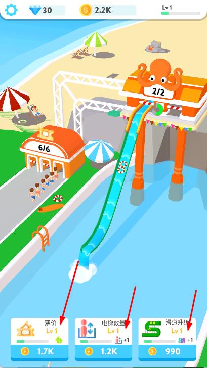 2、积累金币后,在界面下方可以升级“票价”“电梯数量”“滑道升级”,增加收益与设施容量。