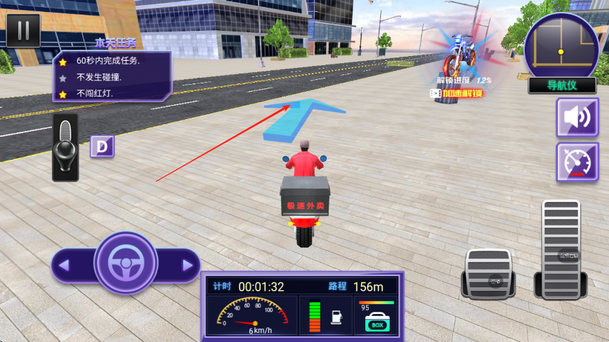1、进入游戏后,选择初始交通工具摩托车,查看订单地址与路线,根据提示学习如何控制车辆启动、转向。