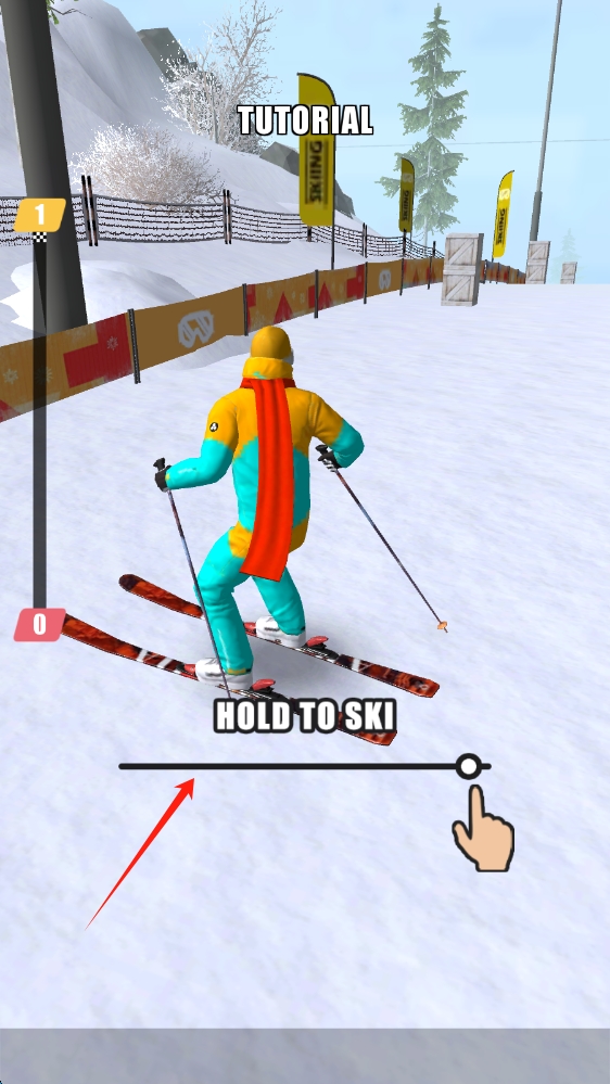 1、首图:教程TUTORIAL阶段,提示 按住HOLDTOSKI操作滑雪,角色着彩色滑雪服,滑动开始。