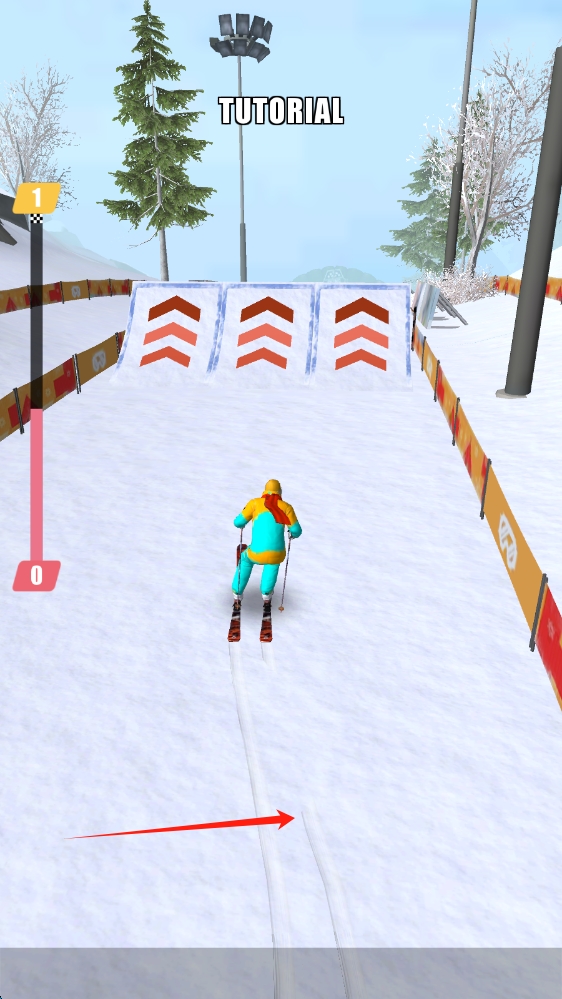 2、第二张:教程关卡,需操控角色避开雪道障碍,延续滑雪竞速挑战,滑动移动人物。