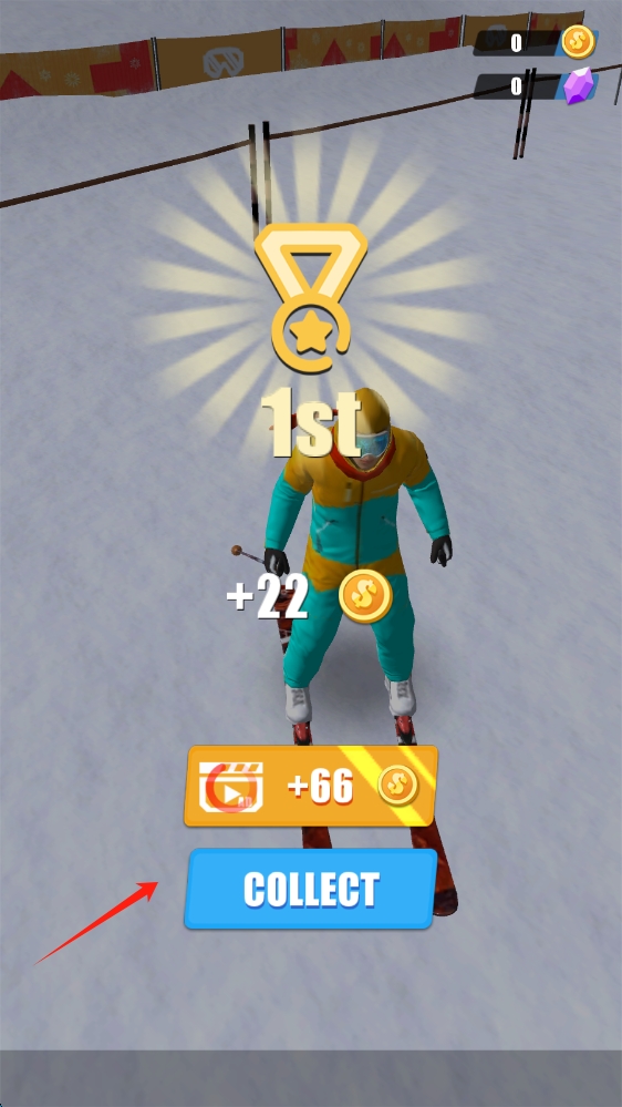 3、第三张:关卡结算,获1st第一名奖励22金币,有COLLECT收集按钮、看视频翻倍金币选项,点击收集。