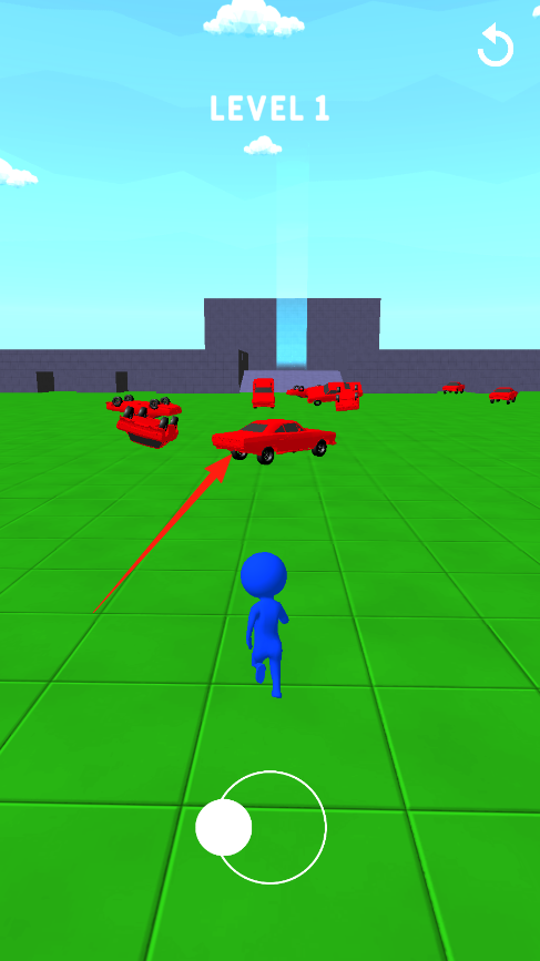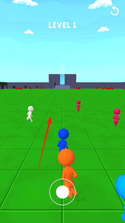 1、操控蓝色角色或其他颜色,沿箭头方向,在绿色场地奔跑,避开前方红色车辆,朝着前方奔跑。