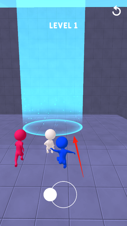 3、到达终点区域蓝色光圈,与其他存活角色红、白竞争,率先进入光圈,完成关卡。