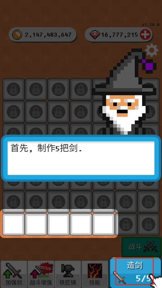 1、首先查看界面下方造剑按钮进度为5/5,点击该按钮,消耗材料完成5把剑制作,按指引推进任务流程。