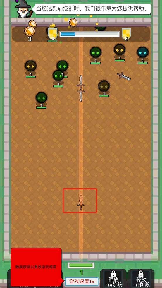 2、进入战斗场景,操控红框内剑移动,躲避怪物同时利用剑攻击,可调整游戏速度1x按钮适配战斗节奏,清理场内怪物。