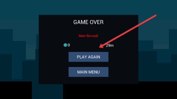 3、游戏结束后,若想重玩点击PLAY-AGAIN,回主菜单选MAIN-MENU,可查看新记录29m,再启跑酷征程。