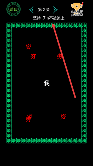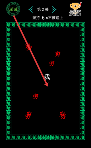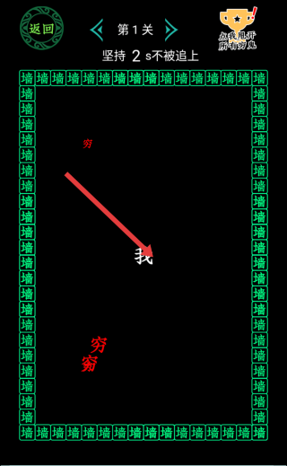 1、在通关关卡1的时候,操控我字移动,避开红色穷字,在绿色围墙内坚持2秒,利用有限的场逃开追击。