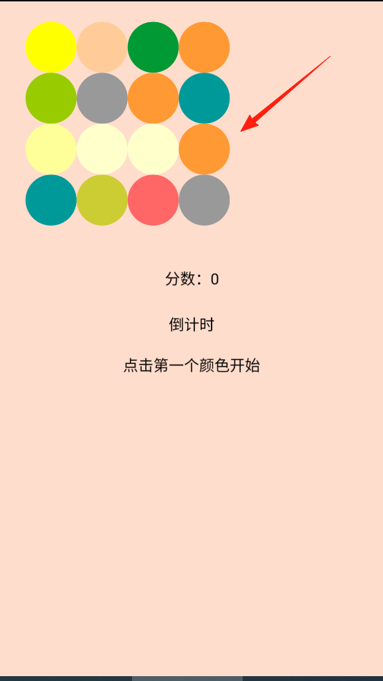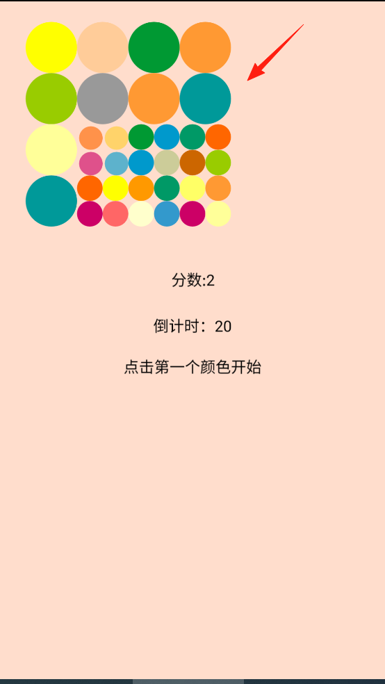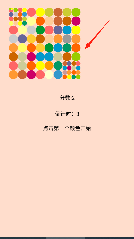 1、打开魔法颜色球,按提示点击第一个颜色启动,这个你想选哪个颜色都可以,倒计时开启后,需快速找同色圆球,靠寻找同色圆点冲击高分。