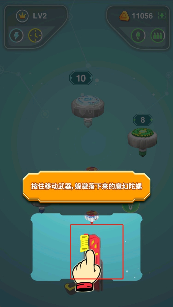 1、进入引导关卡,长按提示的武器按钮移动,紧盯上方下落的魔幻陀螺,预判轨迹灵活避让,保证武器不被撞击。