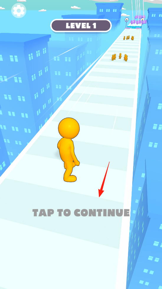 1、来到第一关,点击下方TAP TO CONTINUE提示你开启挑战,轻触屏幕,小人就会往前跑,沿着这条高空跑道,去迎接前方的对手和障碍,开启一场刺激的跑酷冒险。