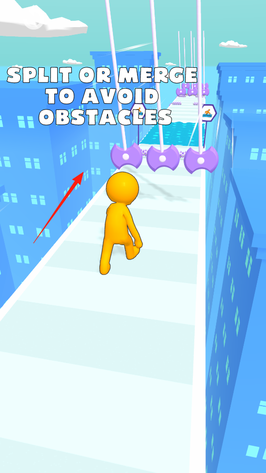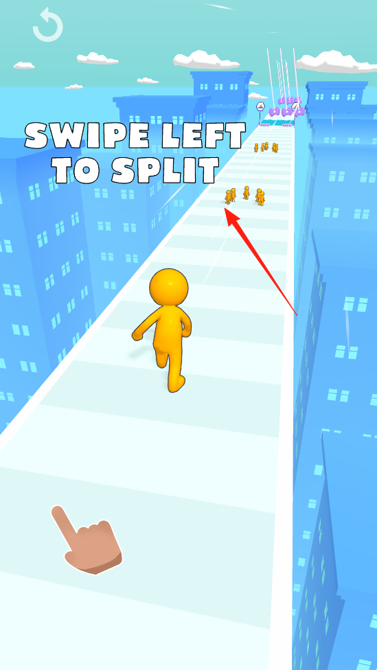 2、跑酷中遇到敌人,根据界面提示SWIPE LEFT TO SPLIT,向左滑动屏幕,让黄色小人分裂成多个,这样就能分散攻击对手,把前方的小人群逐个击破。