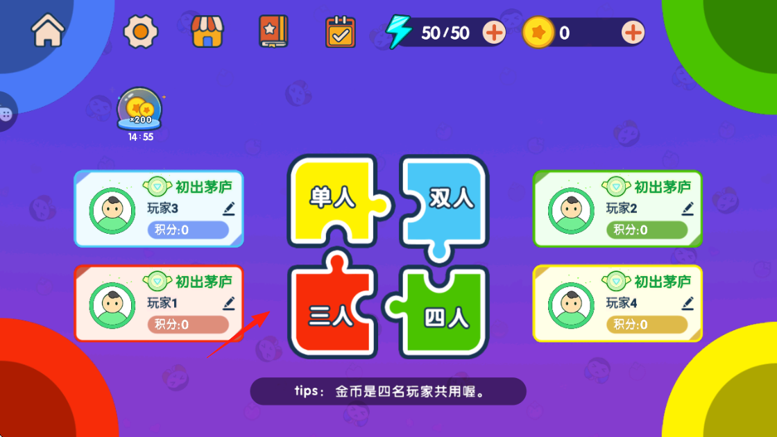 1、进入游戏界面点击三人模式头指向,匹配玩家玩家1-4,消耗闪电50/50进入对战。