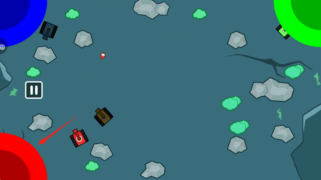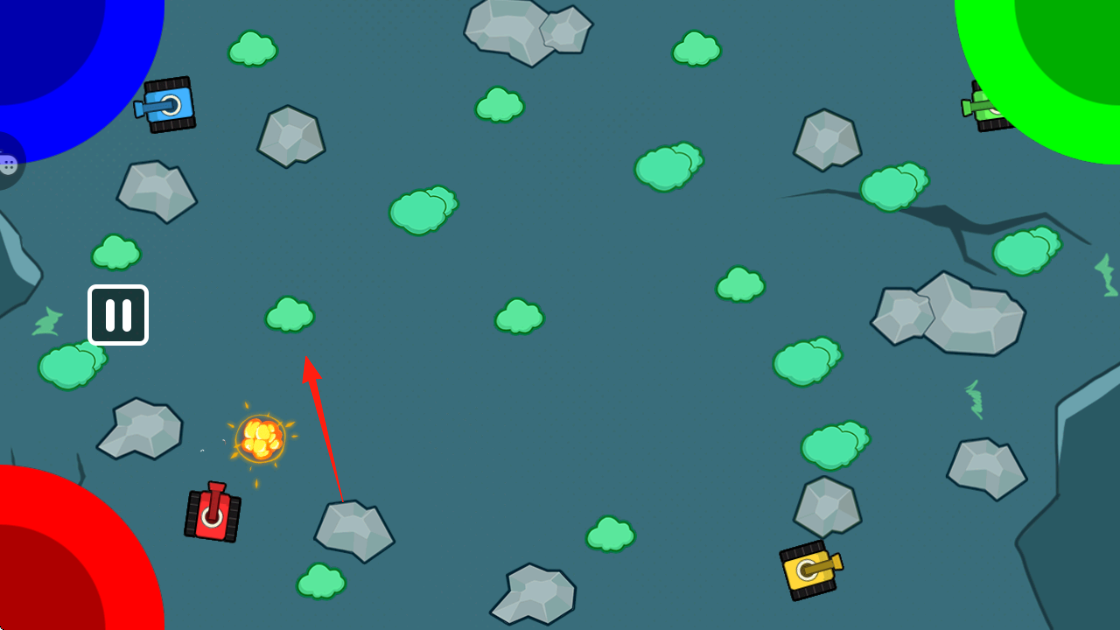 2、在战场中,操控红色坦克箭头指向,避开障碍石头、草丛,攻击敌方坦克蓝、绿、黄。