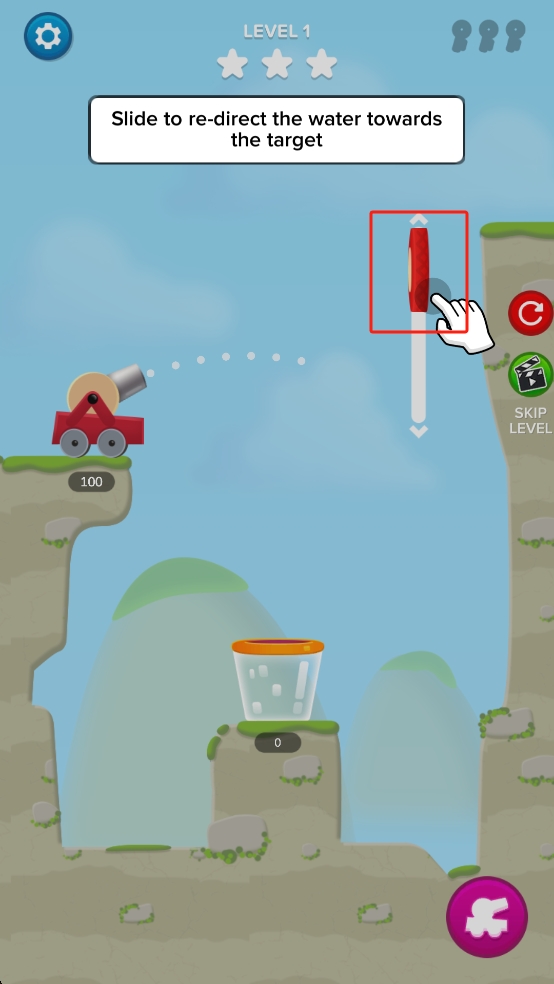 1、首先依据提示滑动红色挡板,调整水流方向,让炮弹发射的水轨迹对准目标容器,规划好角度,为接水做准备。