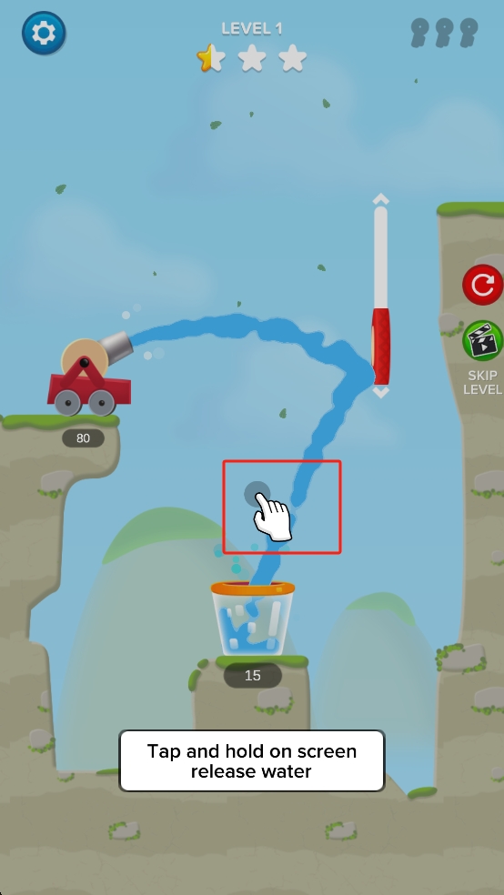 2、调整好挡板后,点击并长按屏幕即可发射水流,让水顺着规划路径落入容器,留意容器水量变化,确保接满水通关。