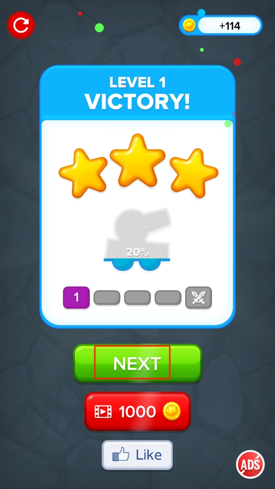3、胜利界面显示三星奖励与金币,想继续下一关点绿色NEXT按钮即可,若想获取更多金币,可选择看广告的红色按钮。