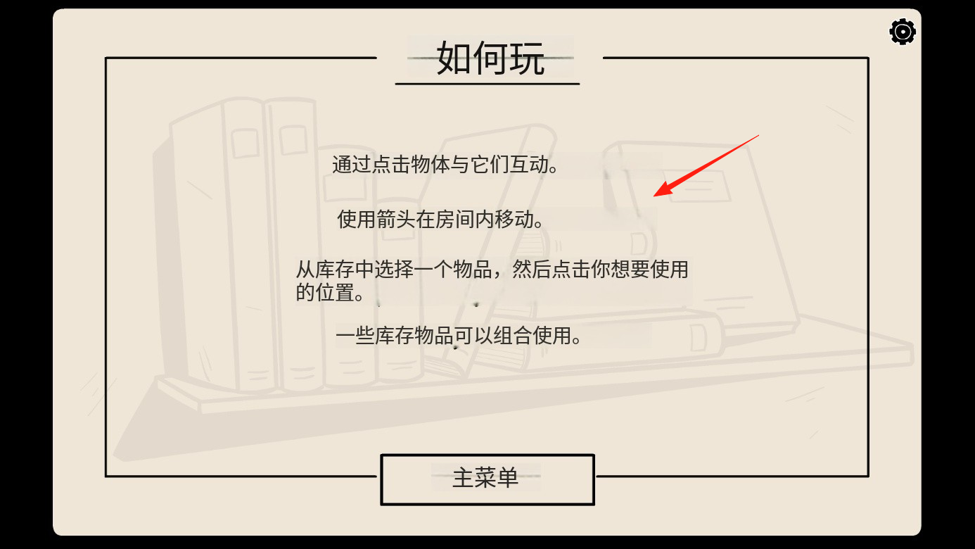 2、进入如何玩界面,仔细读规则,点击物体互动用箭头在房间移动,从库存选物品用在对应位置,部分物品能组合,记住这些操作逻辑,回到主菜单开始游戏,就能更顺畅地探索。