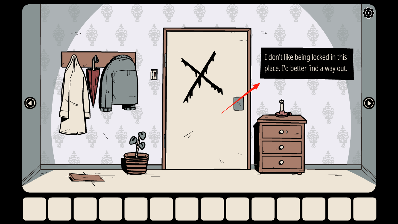 3、进入房间场景,看到门上的X、对话气泡说想逃出去,先观察周围,点击衣架盆栽抽屉等找线索,用箭头按钮在房间移动探索,尝试组合或使用,解开机关帮角色逃出房间。