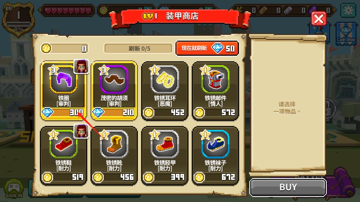 2、进入装甲商店,若钻石足够,购买铁圈等装备,提升角色属性,增强战斗能力,点击购买物品。