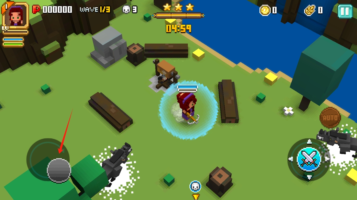 3、战斗时,滑动左侧摇杆移动角色,躲避怪物攻击,推进WAVE-1关卡流程,拨动轮盘移动人物。