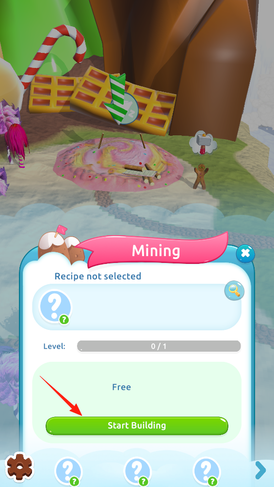 2、靠近粉色区域后,弹出Mining界面,显示Recipe not selected,但有Free选项,点击Start Building,开始在这个区域建造,需要收集材料组装建筑,跟着指引操作。