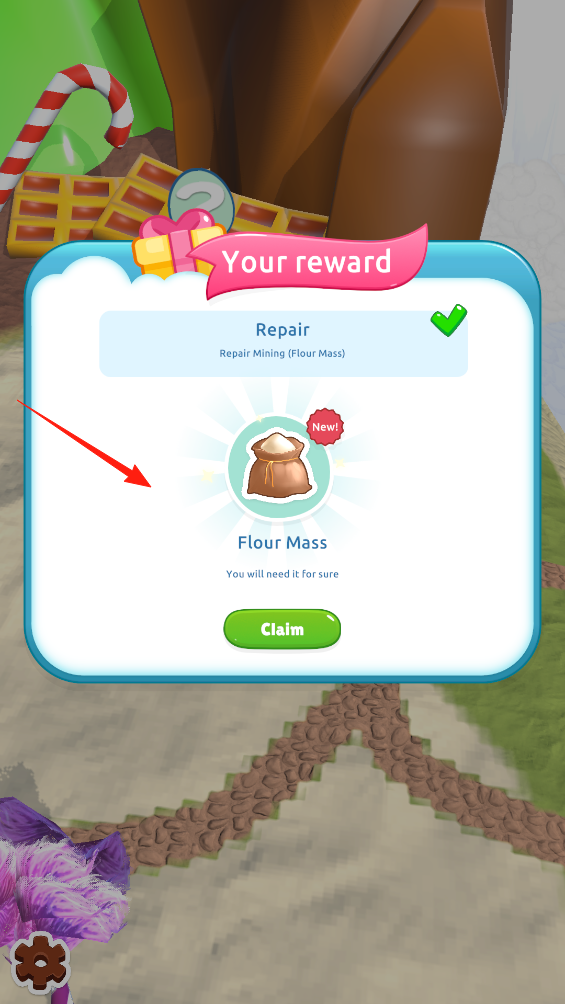 3、完成建造后,弹出奖励界面,显示Flour Mass奖励,点击Claim收下奖励,这袋面粉在后续建造或任务里应该有用,每完成一次建造,就收获新物资,继续在甜蜜世界探索、建造。