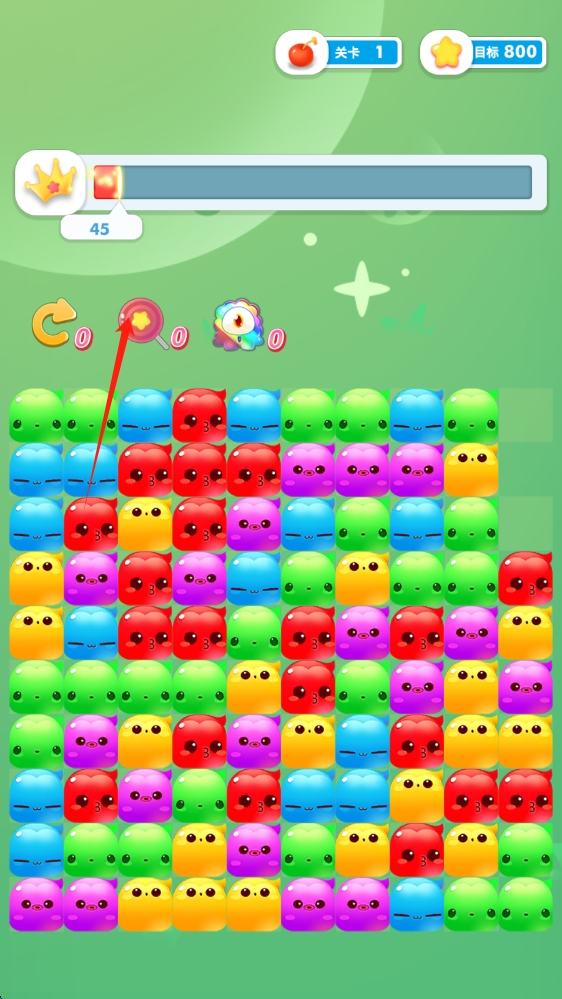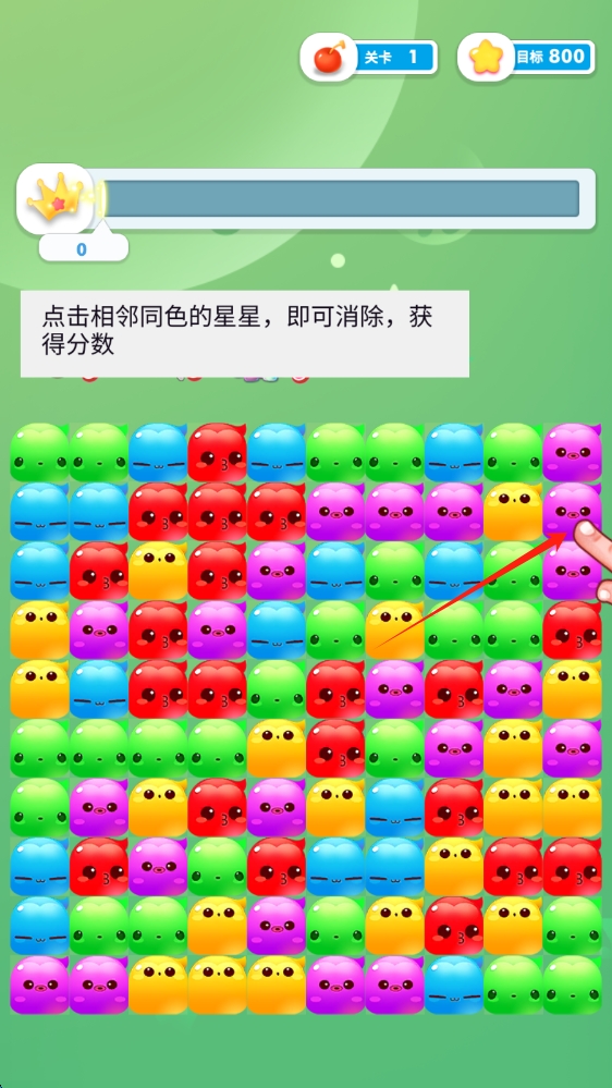 1、关卡1中,寻找相邻同色星星点击消除,尽量连消多组,快速达成800分目标,点击消除相同。